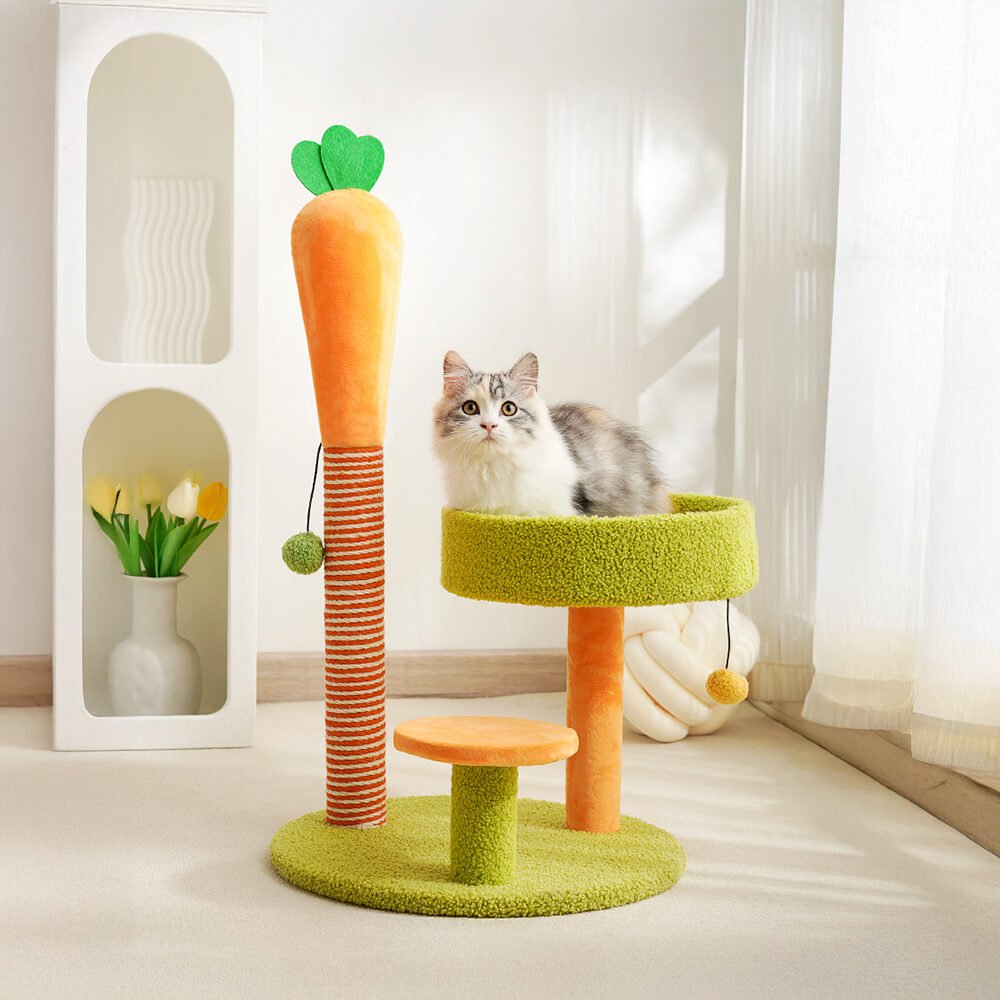 - Carrot-Inspired Design: Perfect for both design-savvy pet owners and those looking to add a pop of color, this whimsical carrot-themed cat tree seamlessly fits into modern apartment living rooms or cozy home spaces.